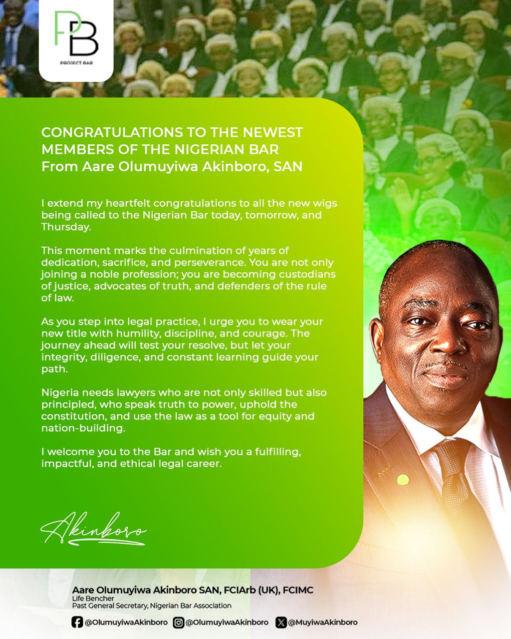 As thousands of young legal minds across the country mark a significant turning point in their professional lives, Aare Olumuyiwa Akinboro, SAN, has extended a message of warm congratulations and counsel to the latest entrants into the legal profession.
